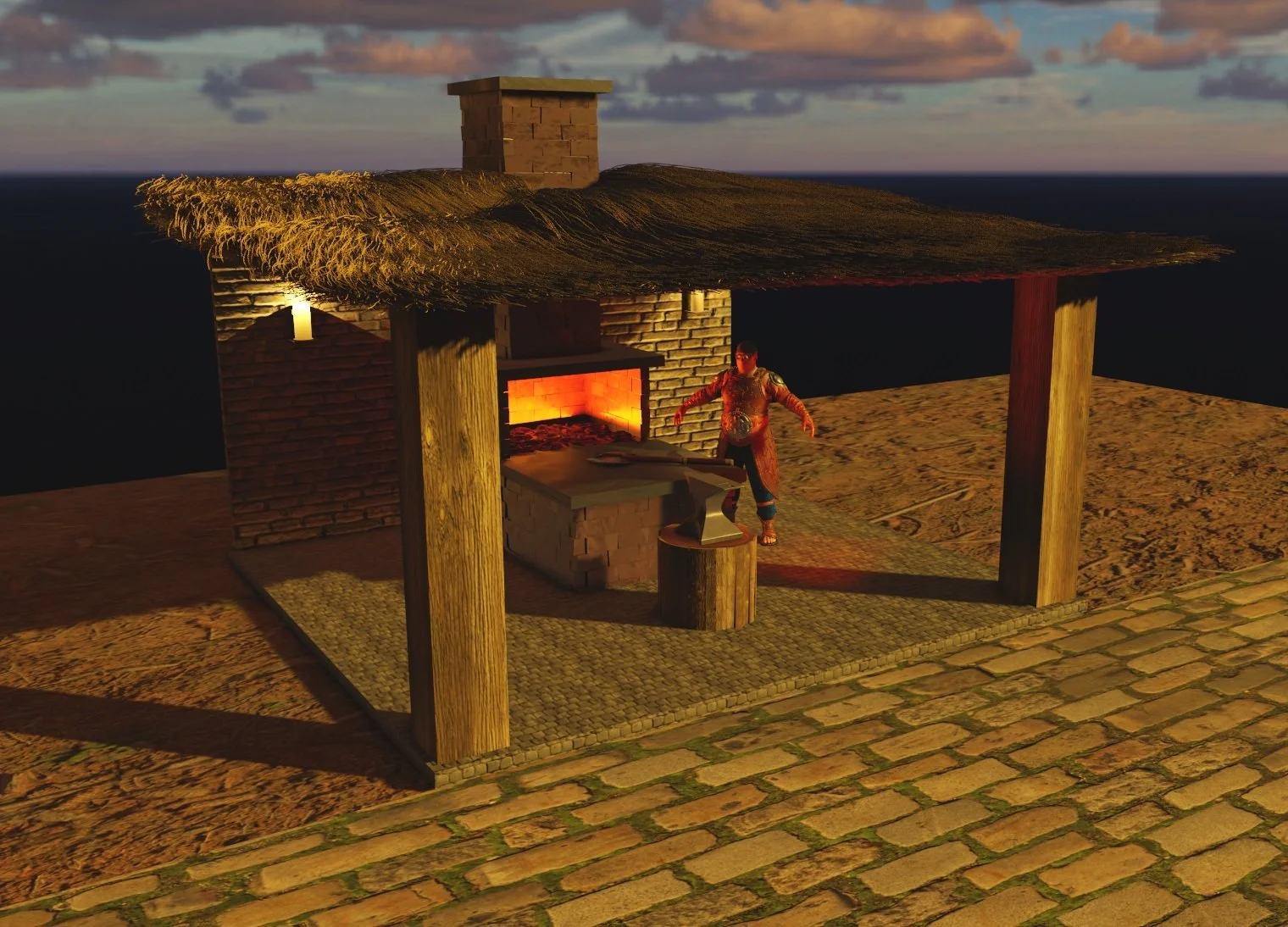 This project was created as part of a Blender-focused course, where I developed a fully modeled scene from start to finish, incorporating lighting and materials. The concept was to capture a glimpse of a medieval street, highlighting the forging of an axe in progress. Every element in the scene, from the forge to the straw roof, was meticulously modeled in Blender, with the exception of the Blacksmith character.